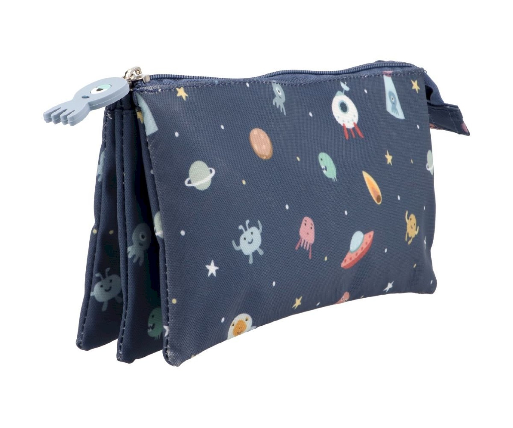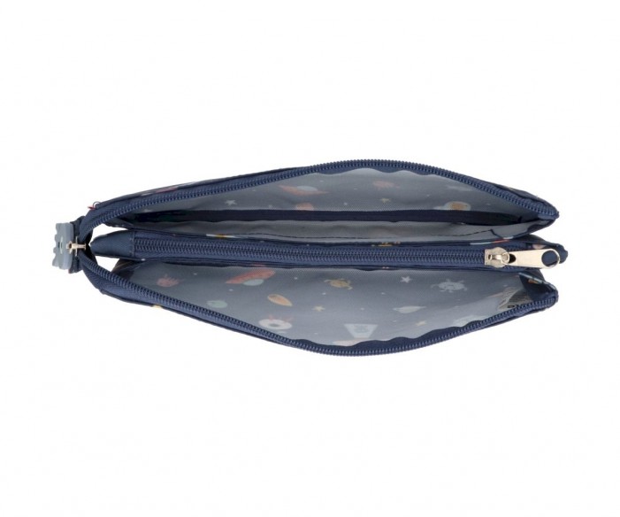 Un completo estuche para llevar todo el material escolar ordenado en distintos compartimentos. Compuesto por una cremallera principal cuyo interior separa 3 zonas distintas, una de las cuales, también se cierra con cremallera.