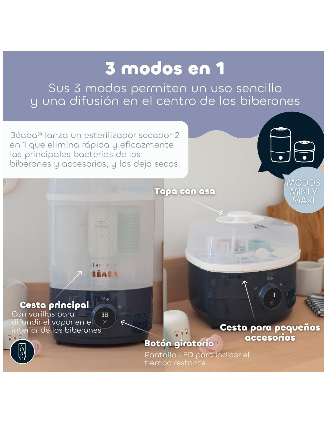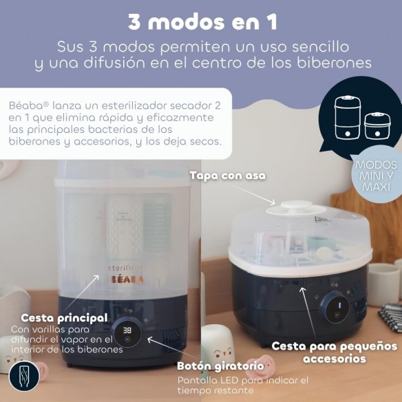 - 2 espacios autónomos, una solución modular muy práctica que se adapta a tus necesidades: Maxi: para biberones de todos los tamaños. Mini: ideal para esterilizar pequeños accesorios (tetinas, chupetes, piezas de sacaleches, etc.).