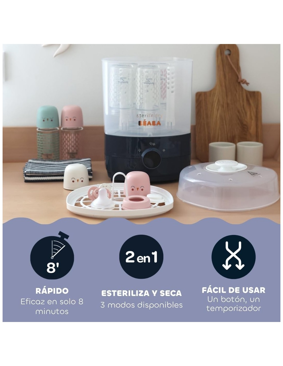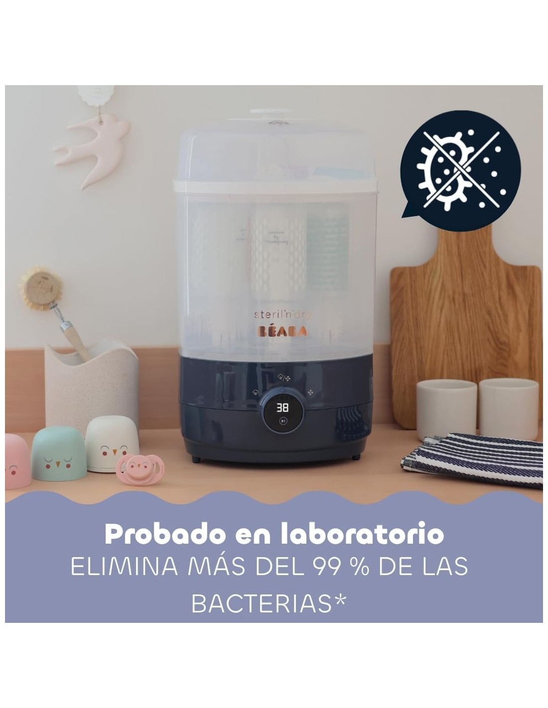 Fácil de usar, difunde vapor y aire caliente en el interior de los elementos para una perfecta eliminación de microbios y bacterias y proteger así el vulnerable sistema digestivo de tu pequeño.